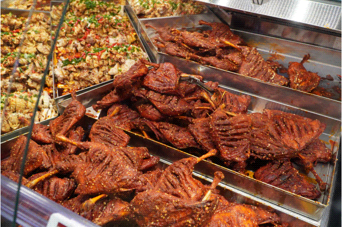 轉(zhuǎn)身來到煙火氣繚繞的熟食鹵味區(qū),儼然變身成為美食的市集,煨在陶罐里的瓦罐湯飄散著肉香,煌上煌的醬鹵鴨脖泛著紅亮油光,剛出爐的烤鴨泛著油亮的光澤,最引人駐足的當(dāng)屬小龍蝦專柜,新鮮出鍋的小龍蝦堆成“紅霞山”,麻辣、蒜香、十三香等三種口味供消費者選擇!斑@個季節(jié)在南昌,沒有小龍蝦就不叫過夏天!”正在購物的90后情侶感嘆道。