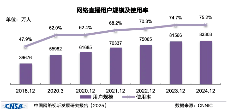 淘寶如此,抖音、快手等平臺更是如此!吨袊W(wǎng)絡視聽發(fā)展研究報告(2025)》顯示,截至2024年12月,我國網(wǎng)絡直播用戶規(guī)模達8.33億,職業(yè)主播數(shù)量達3880萬人,同比增長1.5倍。即使電商帶貨主播只占其中的一成,那也有數(shù)十萬甚至上百萬人之多。
