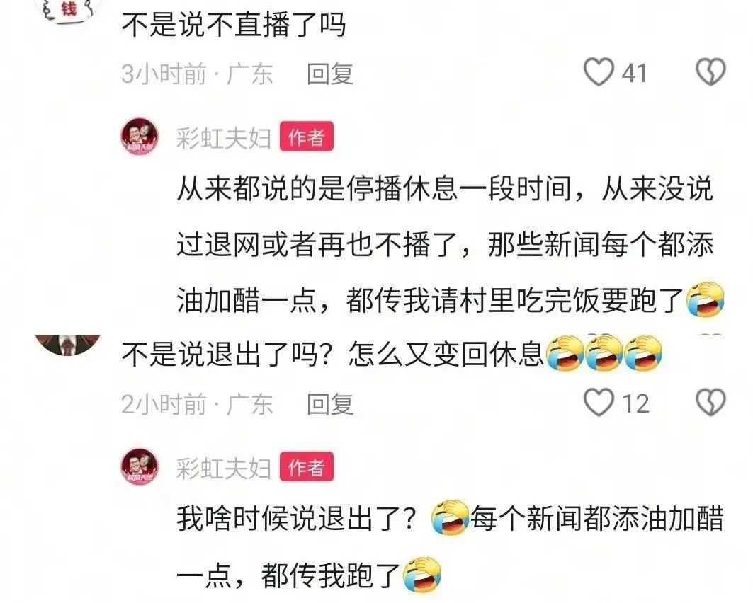 對此彩虹夫婦回應稱:“從來說的是停播休息一段時間,從來沒沒說過退網(wǎng)或者再也不播了!敝劣谕饷娴膫餮,其表示都只是新聞在添油加醋。