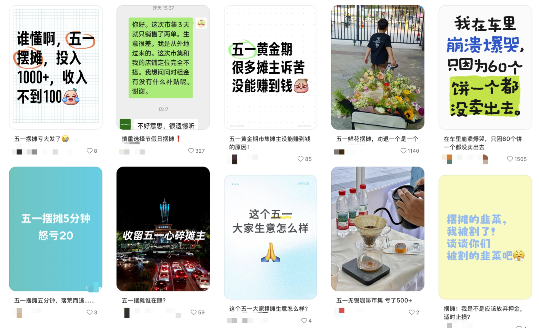 然而,在市集擺攤從來不是一件輕松的事,雖然也有攤主在社交平臺上發(fā)帖表示擺攤?cè)焓杖氤^五萬、日入四位數(shù),但大多數(shù)的攤主需要直面的是暴曬雨淋一整天但日均收入不超過百元的殘酷現(xiàn)實(shí)。今年的五一黃金周里,有不少在市集擺攤的攤主在社交平臺上紛紛發(fā)帖吐槽收入甚微,入不敷出,甚至“有的連攤位費(fèi)都沒賺回來”。