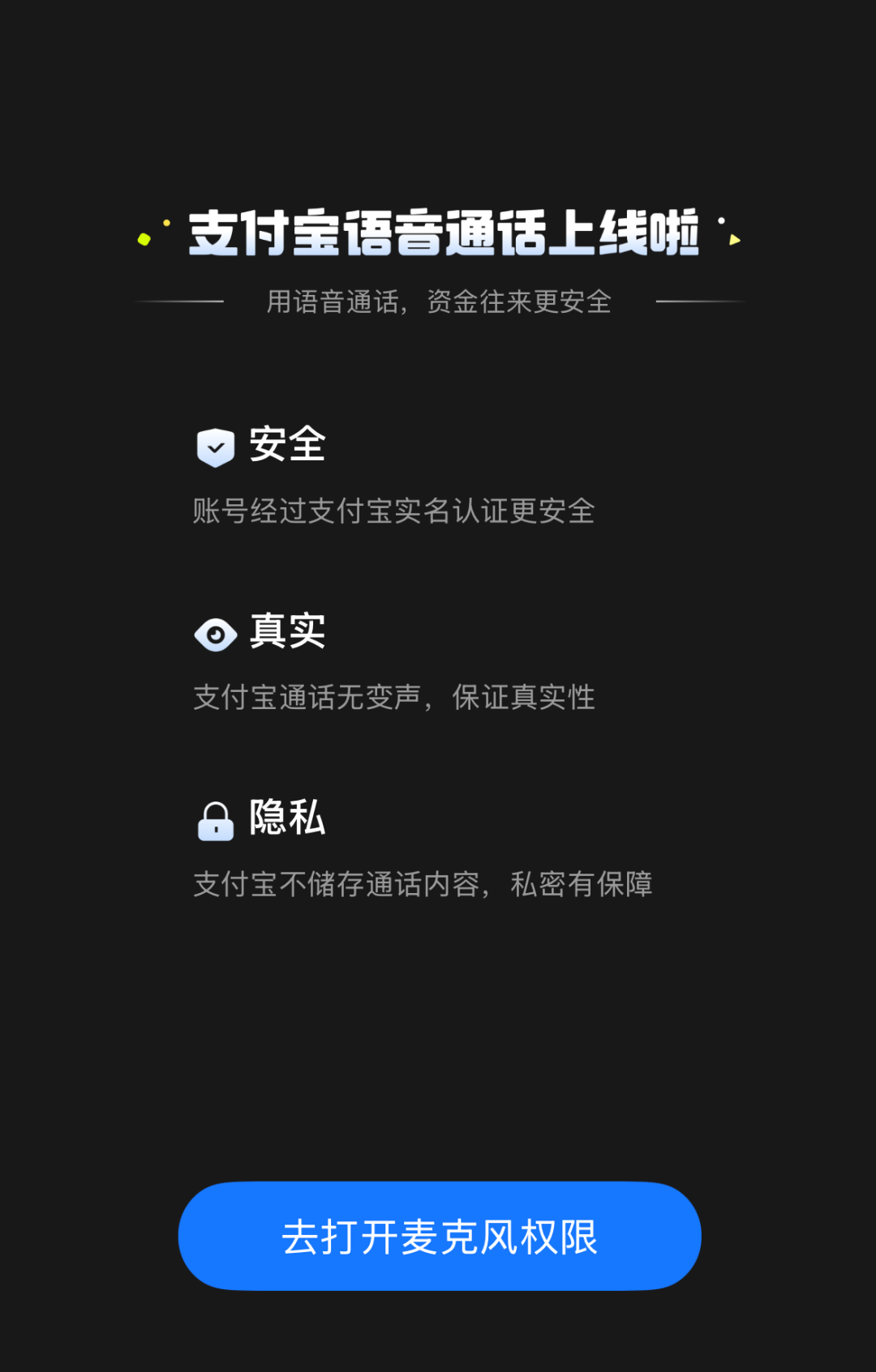 用戶如首次使用語音通話,會看到一個新功能提示頁面,顯示的三條提醒分別為:賬號經(jīng)過支付寶實名認(rèn)證更安全;通話中無變聲,保證真實性,以及不儲存通話內(nèi)容,私密有保障。