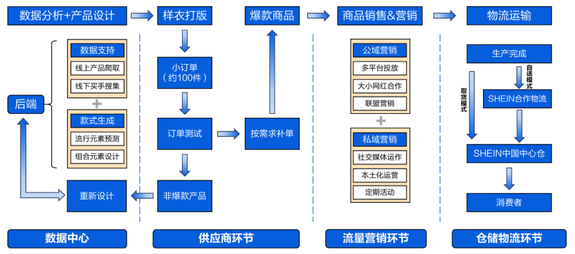 以Shein為代表的第四代快時(shí)尚,通過(guò)信息技術(shù)和AI,結(jié)合了第一代GAP的管理模式,第二代迅銷的成本優(yōu)勢(shì),第三代Indiex從設(shè)計(jì)到銷售的全流程優(yōu)勢(shì),拓展出“小單快反”模式。