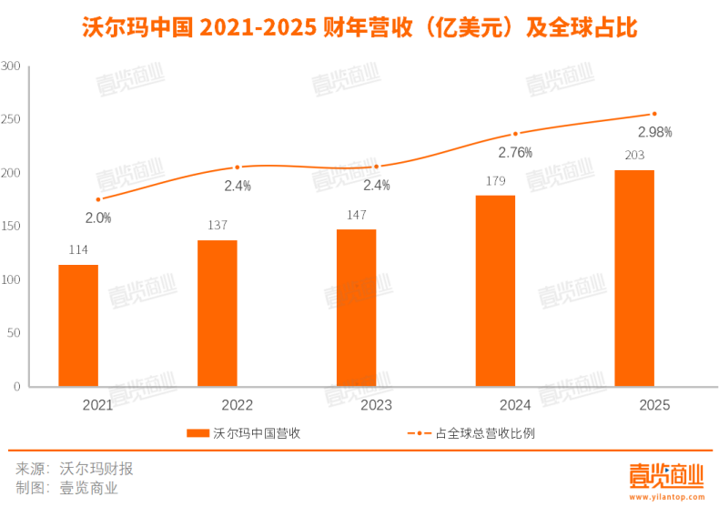然而,財(cái)報(bào)數(shù)據(jù)顯示,沃爾瑪中國(guó)對(duì)全球營(yíng)收的貢獻(xiàn)始終徘徊在3%以下,即便在增速去年,也堪堪到2.98%,因此單從數(shù)據(jù)考量,這一占比對(duì)沃爾瑪全球業(yè)務(wù)的直接影響微乎其微。