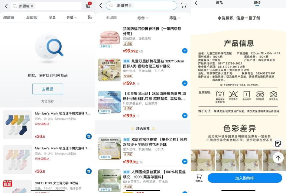 從左至右,分別為山姆APP、沃爾瑪APP、沃爾瑪“新疆棉”關(guān)聯(lián)產(chǎn)品