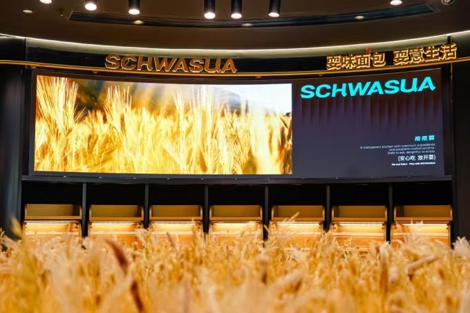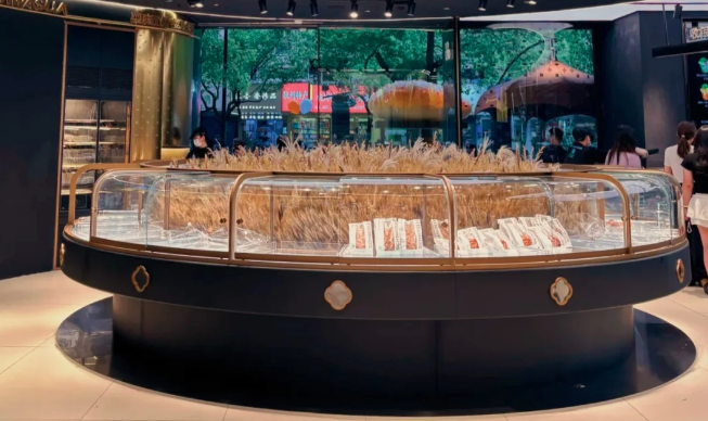 拾㧚耍位于杭州西湖銀泰百貨一樓外圍,整體采用黑金色調(diào),店外試吃區(qū)陳列著一個三米巨型牛角包造型裝置,進(jìn)門就可以看到一個圓形的商品展示柜,中空區(qū)域插著2000根鍍金麥穗,門店裝修設(shè)計格外惹人注目。