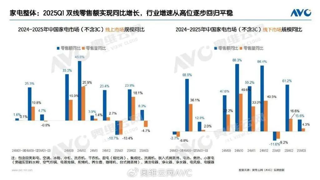 2025年第一季度,社會(huì)消費(fèi)品零售總額124671億元,同比增長(zhǎng)4.6%,比上年全年加快1.1個(gè)百分點(diǎn)。據(jù)奧維云網(wǎng)(AVC)監(jiān)測(cè)數(shù)據(jù),2025年Q1中國(guó)家電市場(chǎng)(不含3C)零售額同比穩(wěn)步上揚(yáng),線上零售額同比4.7%,線下零售額同比12.8%,隨著國(guó)補(bǔ)的常態(tài)化,家電市場(chǎng)從高增長(zhǎng)進(jìn)入穩(wěn)增長(zhǎng)。