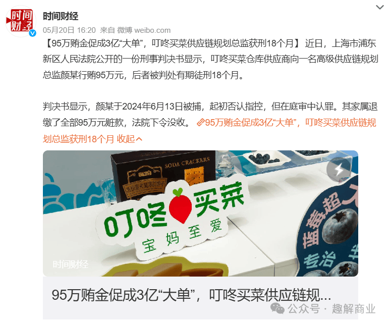 零售是彎腰撿鋼镚的苦生意,需要從細(xì)枝末節(jié)處優(yōu)化成本、提升效率。這其中也包括內(nèi)部人員的管理。最近,叮咚買菜供應(yīng)鏈規(guī)劃總監(jiān)顏某,因受供應(yīng)商賄賂95萬元被判處有期徒刑。2022年,叮咚買菜蔬菜、水產(chǎn)部的相關(guān)采購負(fù)責(zé)人也都曾因受賄被法院宣判。