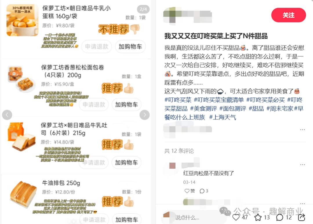 據(jù)不完全統(tǒng)計,叮咚買菜的自營品牌已經(jīng)覆蓋肉蛋奶、谷物,等多種食品,其中也包括毛利50%以上的烘焙賽道。“趣解商業(yè)”注意到,叮咚買菜的甜品糕點產(chǎn)品在社交平臺上好評頗多,除了榴蓮千層、瑞士卷等網(wǎng)紅款,也有“酸奶夾”“脆墩墩”等獨家的特色甜品。
