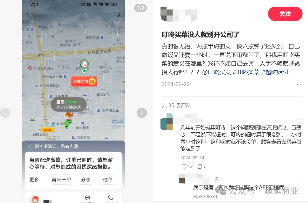 履約效率的提升勢必會給騎手帶來壓力。2022年有媒體報道,叮咚買菜減少了各站點的騎手?jǐn)?shù)量!叭そ馍虡I(yè)”注意到,最近一年,時常有叮咚的騎手在社交平臺上吐槽,在叮咚干“性價比不高”,送同一個地址兩單只算一單的價格。也時常有消費者在小紅書上吐槽,叮咚買菜的配送“超時”非?鋸,遇到惡劣天氣APP常常會爆單,但“叮咚買菜的超時,經(jīng)常會延長一到兩個小時,非常夸張!