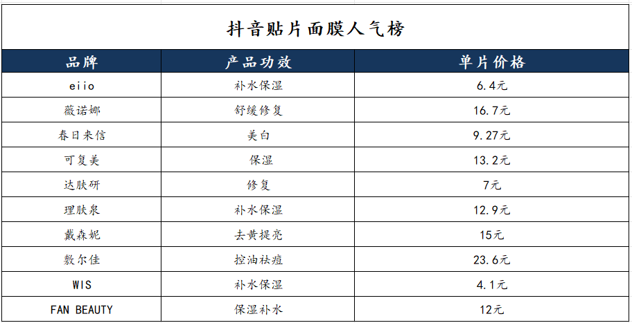從以抖音電商平臺(tái)為例,人氣榜單中,貴婦面膜全部缺席,5片裝面膜價(jià)格正式進(jìn)入雙位數(shù)時(shí)代。