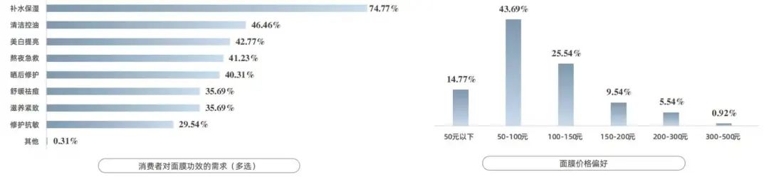 《2024年面膜趨勢(shì)洞察報(bào)告》顯示,截至23年9月,盡管市場(chǎng)上有5.3萬(wàn)個(gè)面膜品牌,囊括了超過(guò)21萬(wàn)個(gè)SKU,但消費(fèi)者在選擇面膜時(shí),有75%的消費(fèi)者對(duì)面膜產(chǎn)品的主要訴求為補(bǔ)水保濕,進(jìn)一步有58%的消費(fèi)者主要考慮低于100元的面膜。