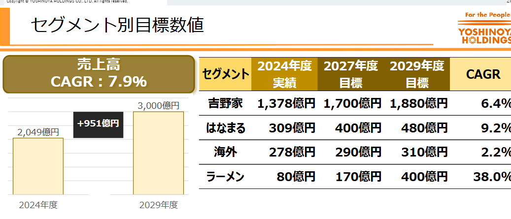 如今80億日元的拉面銷售額只占吉野家總銷售額的4%,而在最近發(fā)布的中期計(jì)劃中,到2029財(cái)年,這一數(shù)字將達(dá)到400億日元(約合人民幣19.91億元),年均增長(zhǎng)38%,占比達(dá)到13%,總店數(shù)則要達(dá)到500家。