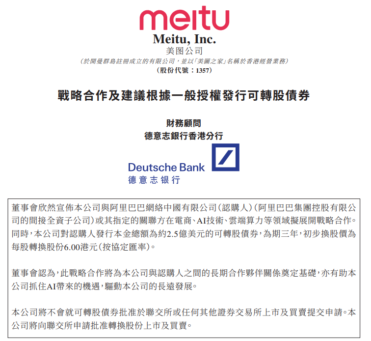公告顯示,阿里巴巴可在發(fā)行日起至到期日前5個工作日行使轉(zhuǎn)換權(quán),按每股6.00港元的價格轉(zhuǎn)換為美圖公司股票。