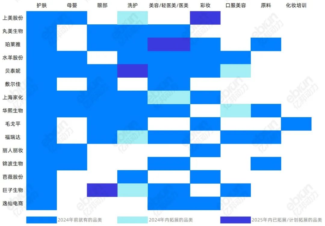 這些品牌以核心業(yè)務(wù)為根基,不斷延伸觸角,多品類、跨賽道布局。國貨龍頭主要集中在護膚品領(lǐng)域,2024年以來重點發(fā)力重組膠原蛋白等產(chǎn)品,同時向彩妝、香水、洗護和嬰童護膚等品類拓展。