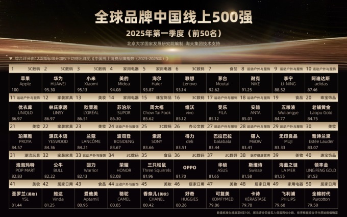 5月21日,由北京大學(xué)國家發(fā)展研究院等機構(gòu)聯(lián)合發(fā)布的2025年第一季度《全球品牌中國線上500強》榜單出爐,蘋果名列第一,華為、小米分列二、三位。登榜的前10名品牌中,有7個為國貨品牌。