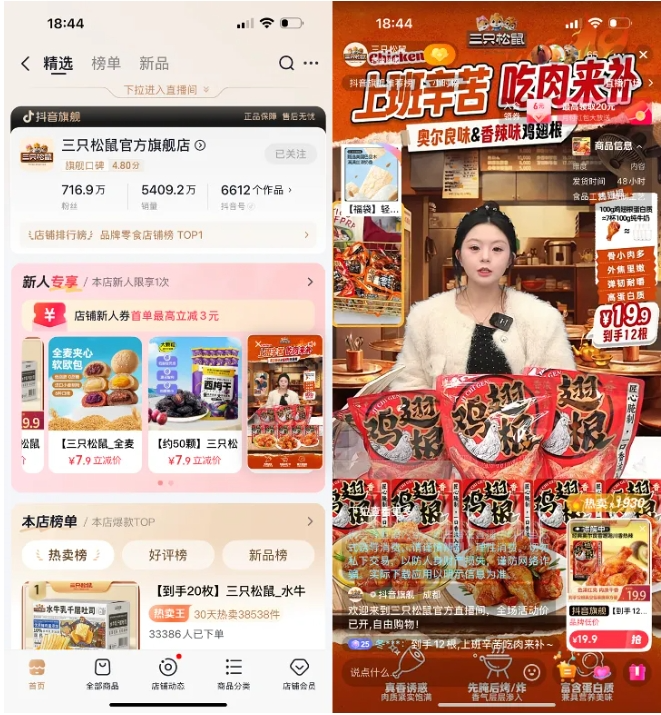 以三只松鼠為例,三只松鼠將“抖+N”(短視頻+全渠道)作為新引擎,抖音已經(jīng)成為三只松鼠的第二增長(zhǎng)曲線。2024年,其抖音渠道收入同比暴漲180%,賈乃亮單場(chǎng)直播破億。除了打造“19.9元10包夏威夷果”等現(xiàn)象級(jí)爆品,三只松鼠真正的殺手锏藏在細(xì)節(jié)里,20個(gè)自播賬號(hào)組成的“直播矩陣”,6000名中腰部達(dá)人的“星火計(jì)劃”,將流量命脈緊緊握在自己手中。
