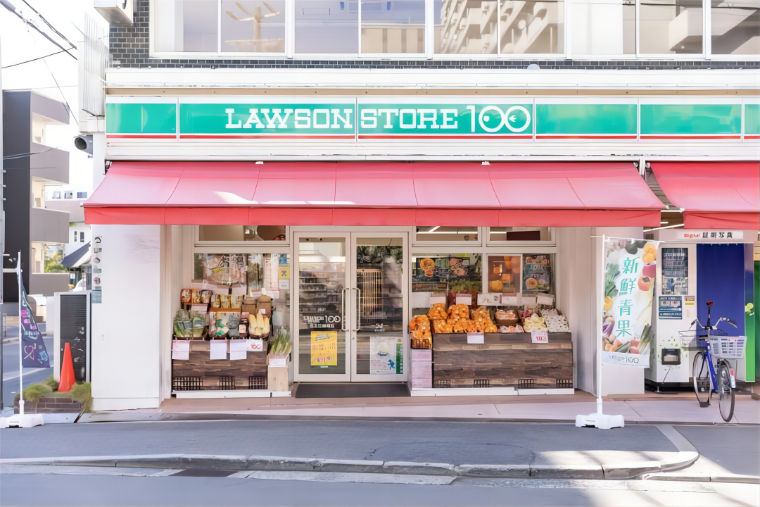 因此,羅森果斷收購(gòu)主打百元均價(jià)的迷你超市“SHOP99”,并將其全面升級(jí)為“羅森100”,開(kāi)創(chuàng)性地打造出“便利店×超市×百元店”的混合業(yè)態(tài)。其醒目的綠色店招與門(mén)口生鮮陳列相得益彰,店內(nèi)依次規(guī)劃生鮮區(qū)、日用品區(qū)和收銀區(qū),在當(dāng)時(shí)千篇一律的便利店業(yè)態(tài)中獨(dú)樹(shù)一幟。