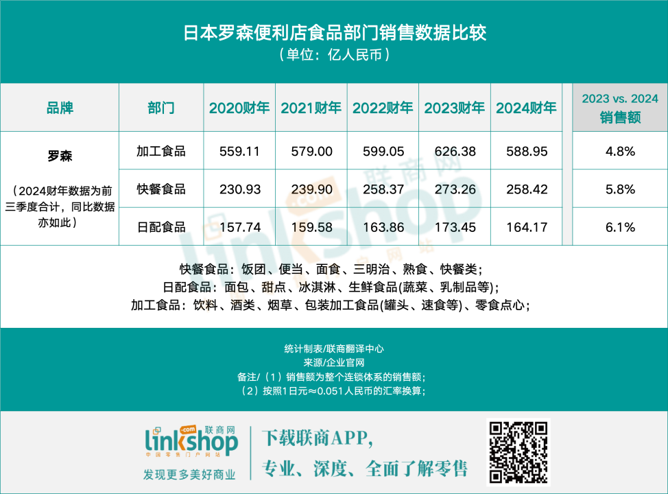 《聯(lián)商網(wǎng)》統(tǒng)計(jì)顯示,2020-2024財(cái)年間,日本羅森食品部門(mén)呈現(xiàn)出“鮮食驅(qū)動(dòng)”特征:快餐食品作為核心增長(zhǎng)引擎,2020-2023財(cái)年累計(jì)增長(zhǎng)達(dá)18.3%,2024年前三季度仍保持5.8%的穩(wěn)健增速;日配食品增長(zhǎng)顯著提速,2024年前三季度以6.1%的增速躍居品類(lèi)首位。相比之下,加工食品3%-4%的增速相對(duì)溫和,增長(zhǎng)依賴(lài)存量市場(chǎng)或小幅提價(jià)。