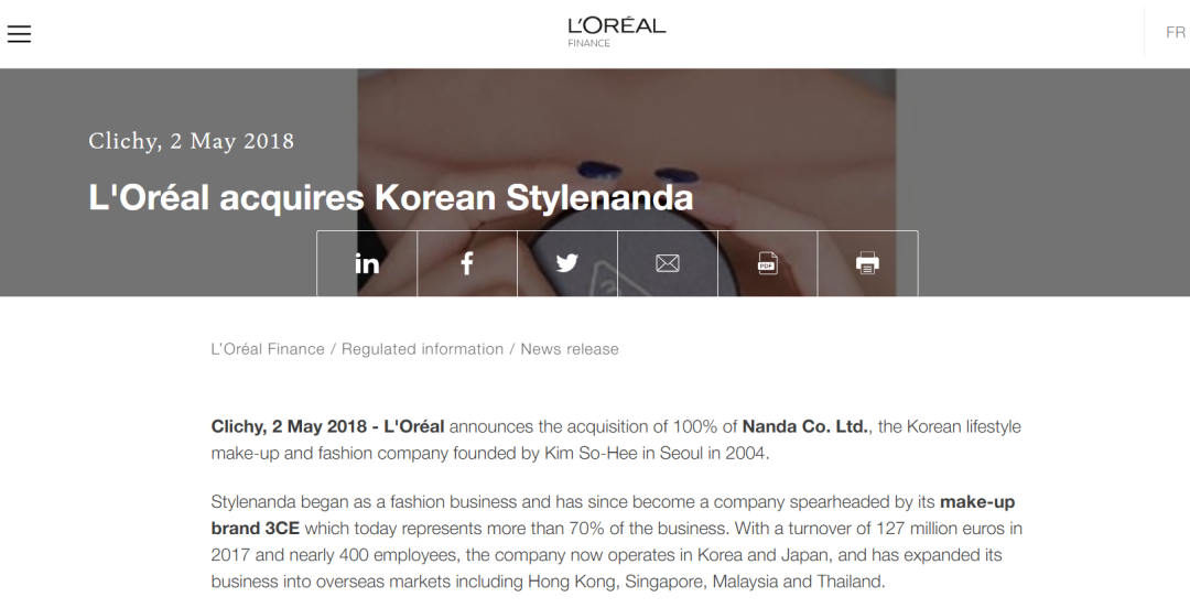 再?gòu)?CE和歐萊雅集團(tuán)的關(guān)系來(lái)看,前文已經(jīng)提到,2018年5月,歐萊雅官網(wǎng)公告稱其已收購(gòu)韓國(guó)生活方式彩妝和時(shí)尚公司Nanda Co. Ltd.的100%股權(quán),但并未公布此次收購(gòu)的交易金額。