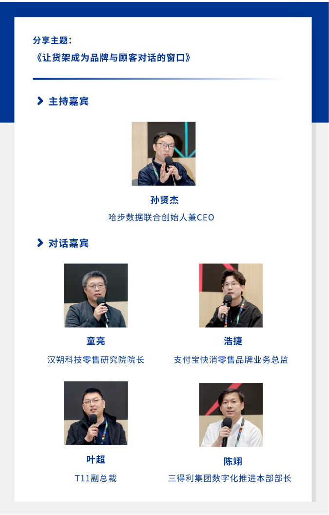 在《讓貨架成為品牌與顧客對話的窗口》圓桌對話中,哈步數(shù)據(jù)聯(lián)合創(chuàng)始人兼CEO孫賢杰作為主持嘉賓,攜手漢朔科技零售研究院院長童亮、T11副總裁葉超、三得利集團(tuán)數(shù)字化推進(jìn)本部部長陳翊、支付寶快消零售品牌業(yè)務(wù)總監(jiān)浩捷共同展開了一場深度交流。從零售商、品牌商、技術(shù)服務(wù)商多方視角出發(fā),深度探討貨架端互動創(chuàng)新、門店全觸點營銷生態(tài)、AI場景化賦能與生態(tài)構(gòu)建、數(shù)字化轉(zhuǎn)型破局等零售前沿問題,為行業(yè)提供技術(shù)賦能與生態(tài)共建的創(chuàng)新思路: