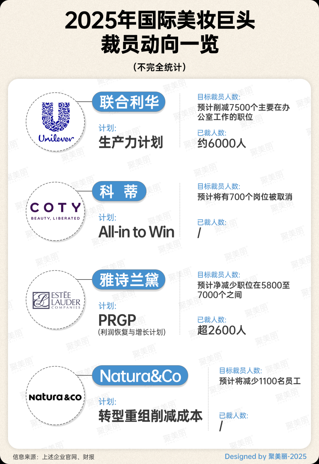 在今年,雅詩蘭黛、聯(lián)合利華等就上演了大規(guī)模裁員。截至2025年第一季度,聯(lián)合利華已裁員6000人(詳見);雅詩蘭黛因PRGP計劃中的重組部分預(yù)計將在2026財年末完成,職位凈減少數(shù)量將在5800至7000個之間。(詳見)