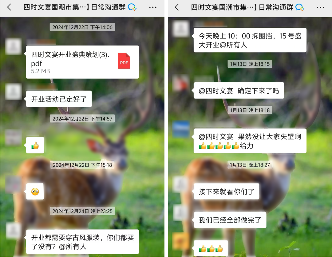 2024年12月22日,東溪薈在商戶群中發(fā)布《開業(yè)盛典策劃案》,宣布將于12月28日舉行正式開業(yè)儀式,包含舞獅點(diǎn)睛、迎賓儀式等內(nèi)容,并建議商戶準(zhǔn)備古風(fēng)服飾配合場景演出。