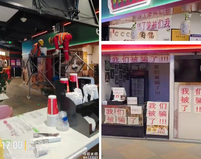 而就在一周前,這一空間仍可自由出入。根據(jù)5月12日流出的現(xiàn)場視頻,多家商戶在門前張貼寫有“我們被騙了”的A4紙張,一些供應(yīng)商正在拆除排煙設(shè)施。