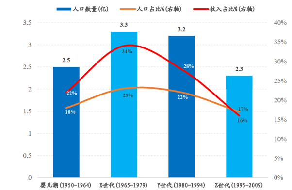 從人群結(jié)構(gòu)上來看,Z世代(1995-2009)的人口和收入占比,分別達到17%和16%,日益成為消費當(dāng)中的中堅力量,因此他們的消費傾向就成了最具成長性的細分方向。