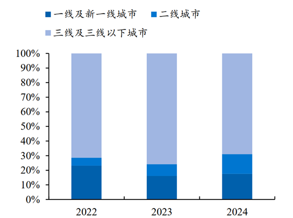 另一個重大變化是低能級區(qū)域的增長性。疫情以來,三四線消費韌性強于一二線,縣鄉(xiāng)好于城市,鄉(xiāng)村又好于城鎮(zhèn),比如在2024年鄉(xiāng)村社零增速為4.3%,城鎮(zhèn)社零增速為3.4%。如果再考慮人口權(quán)重,根據(jù)華創(chuàng)證券的測算,非一二線城市的消費體量,占到整個經(jīng)濟體的60%左右。