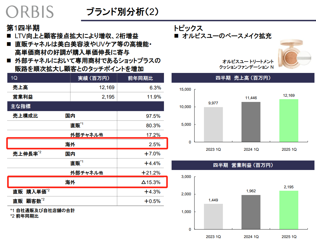 但需要注意的是,在ORBIS奧蜜思凈銷售額構(gòu)成占比中,有97.5%來自于日本本土市場,海外市場凈銷售額占比僅為2.5%,且品牌在該市場的凈銷售額較上年同期下滑15.3%。