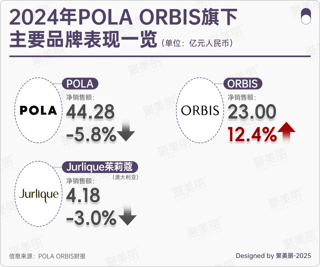 在2025年Q1財(cái)報(bào)中,POLA、Jurlique茱莉蔻品牌凈銷售額同比分別下滑0.3%、8.9%,其中,主要面向海外市場銷售的Jurlique茱莉蔻品牌在中國大陸凈銷售額同比下滑10.5%,在免稅渠道同比下滑17.8%,而ORBIS奧蜜思業(yè)績?nèi)员憩F(xiàn)為營利雙增。