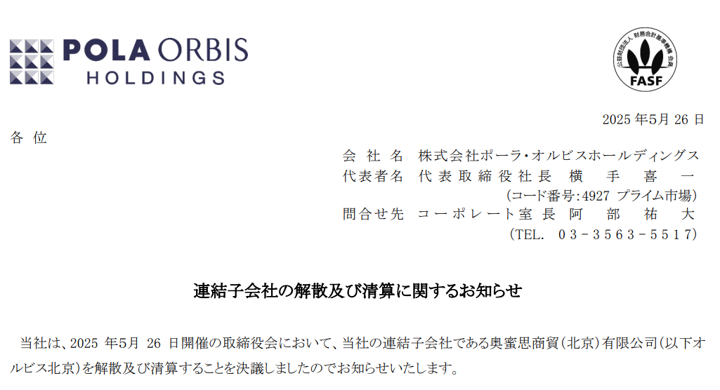 5月26日,POLA ORBIS HOLDINGS寶麗奧蜜思控股集團(tuán)(以下簡稱:POLA集團(tuán))在官網(wǎng)發(fā)文稱,其召開了董事會會議,決定解散并清算其合并子公司奧蜜思商貿(mào)(北京)有限公司(以下簡稱:奧蜜思北京)。