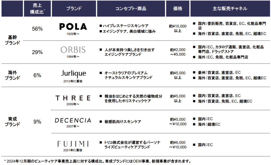 據(jù)POLA集團(tuán)官網(wǎng)信息顯示,POLA ORBIS成立于1929年,業(yè)務(wù)涵蓋美容護(hù)理、房地產(chǎn)等領(lǐng)域,其中,美容護(hù)理作為其核心業(yè)務(wù),占2024年集團(tuán)總業(yè)績的97%,旗下化妝品相關(guān)的主要品牌有POLA、ORBIS奧蜜思等。