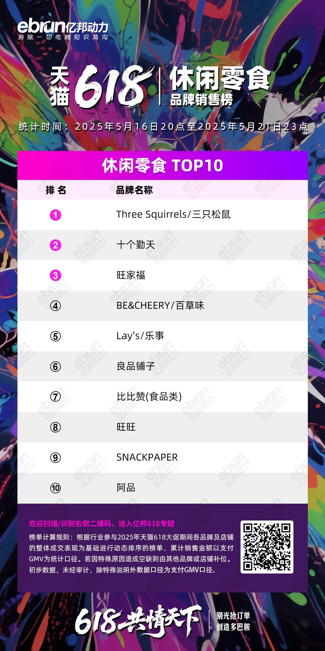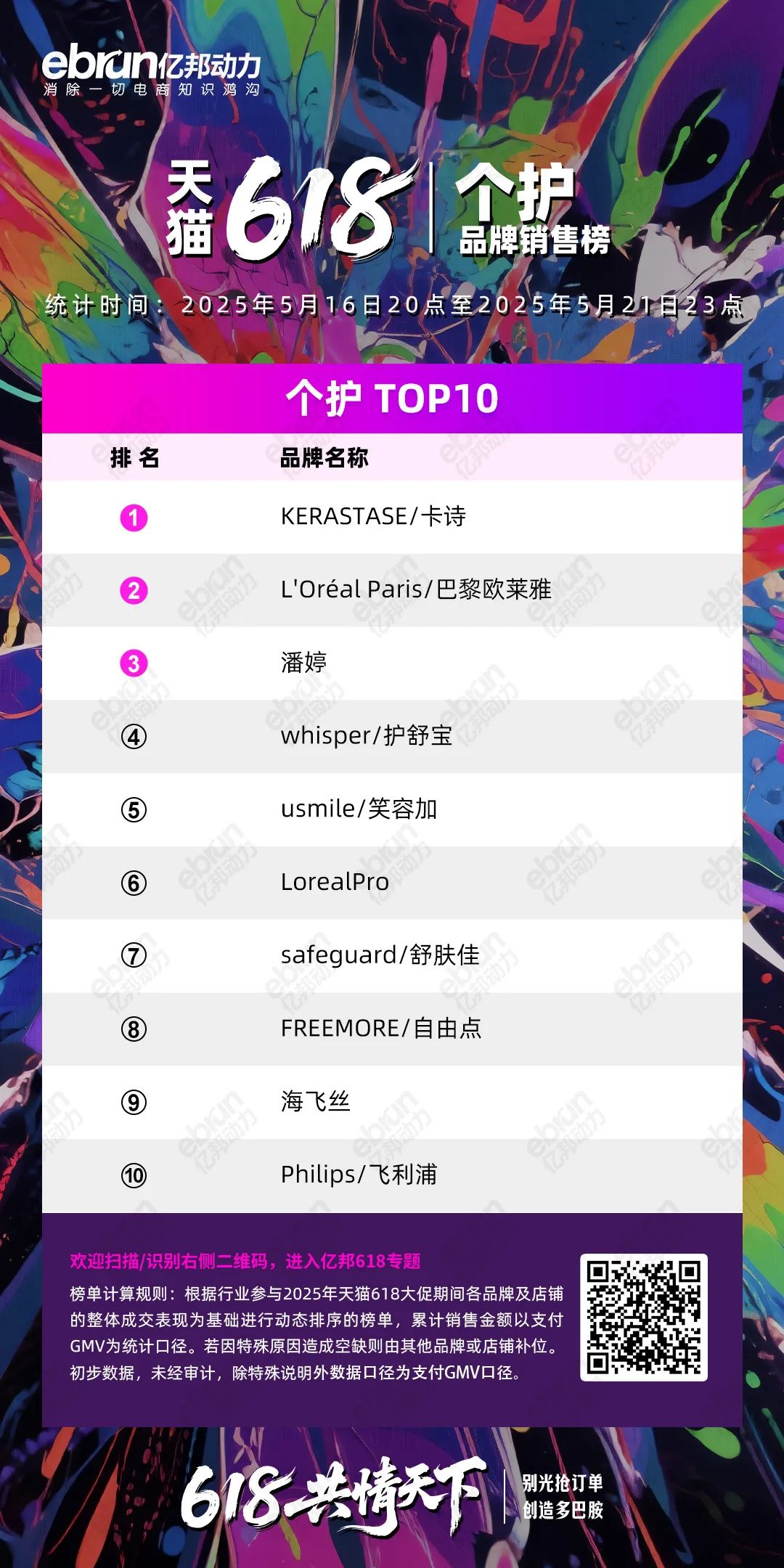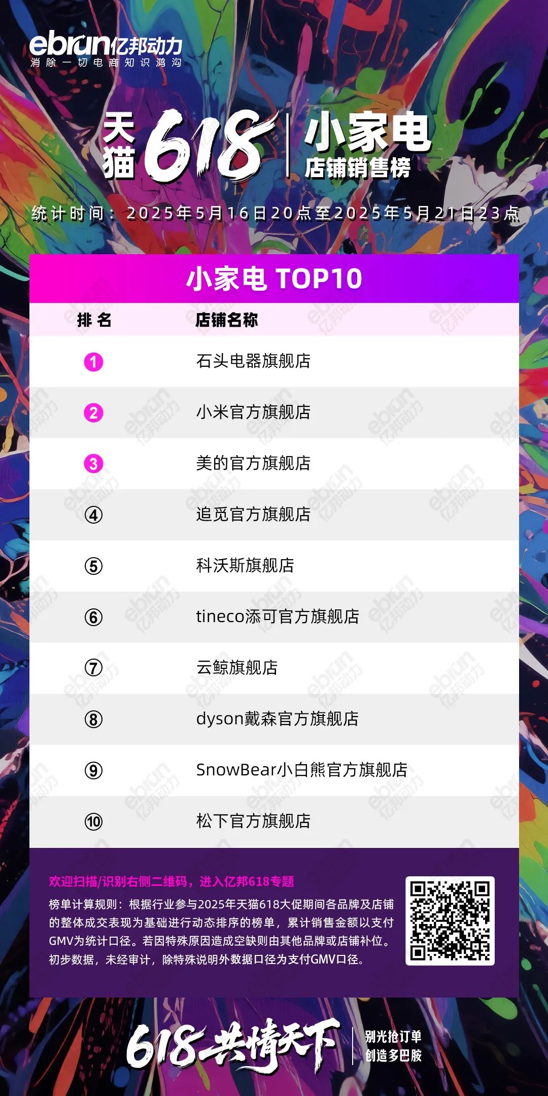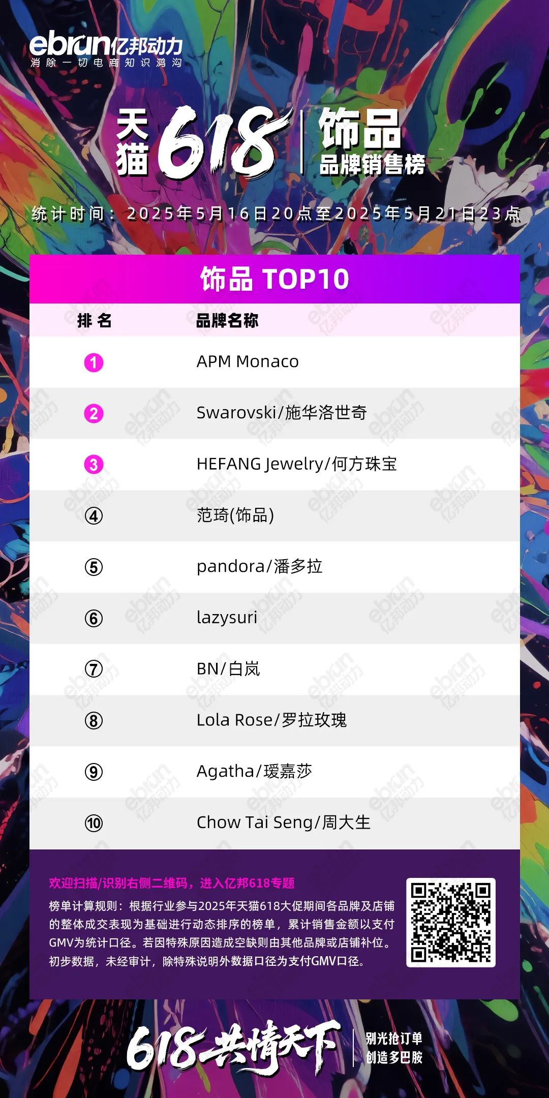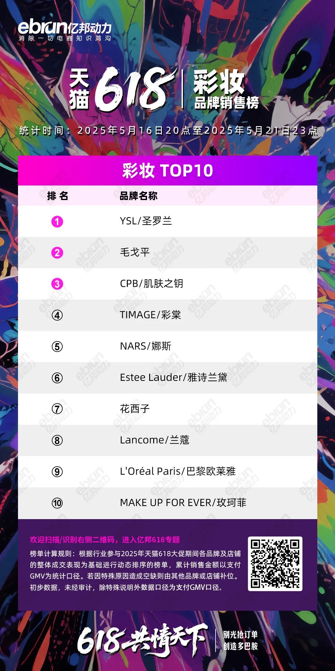 根據(jù)行業(yè)參與2025年天貓618大促期間各品牌及店鋪的整體成交表現(xiàn)為基礎(chǔ)進(jìn)行動(dòng)態(tài)排序的榜單,累計(jì)銷售金額以支付GMV為統(tǒng)計(jì)口徑。若因特殊原因造成空缺則由其他品牌或店鋪補(bǔ)位。初步數(shù)據(jù),未經(jīng)審計(jì),除特殊說(shuō)明外數(shù)據(jù)口徑為支付GMV口徑。