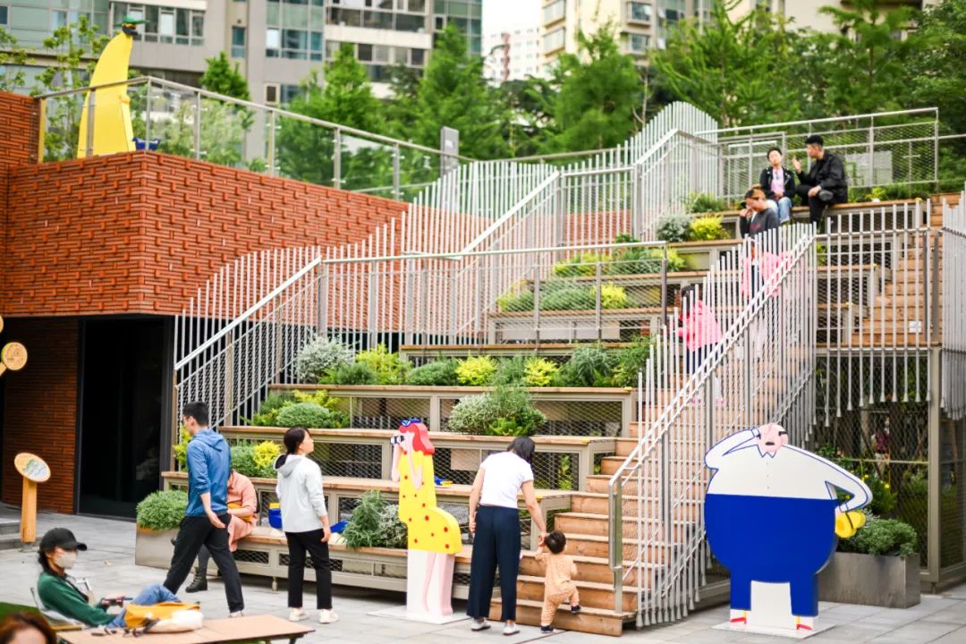 二樓的連廊設(shè)計(jì)有效串聯(lián)項(xiàng)目的所有建筑,滿足人們多層次探索的體驗(yàn);露臺(tái)空間通過幾組階梯的布置,化身為「城市展廊」、「觀演山坡」,不僅能有效引導(dǎo)人們在上下層之間自然地流動(dòng),未來也能構(gòu)建出寵物社交、露天劇場、周末市集等多元場景。