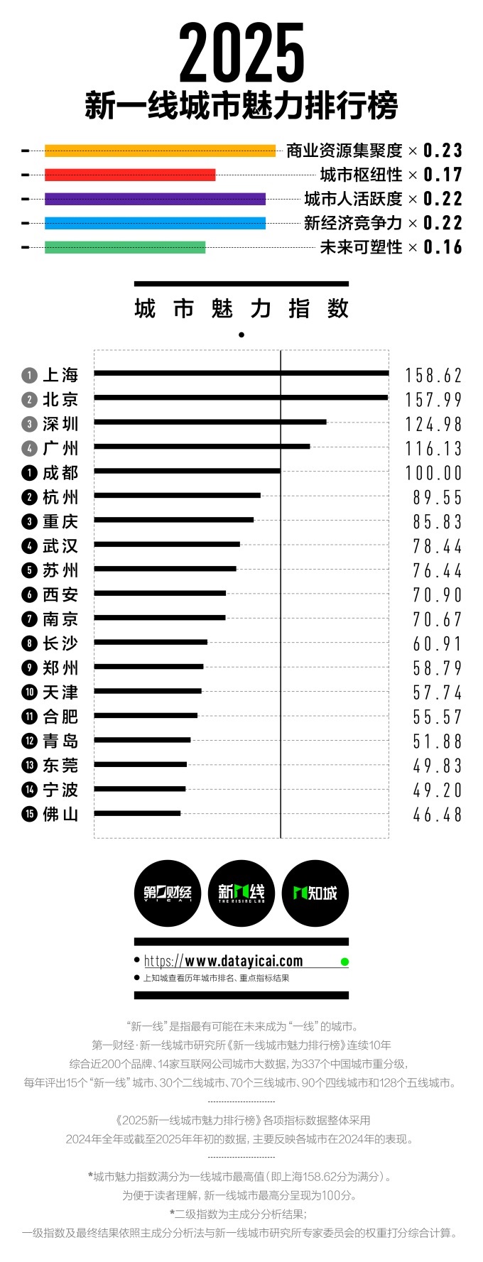 據(jù)悉,2025年《新一線城市魅力排行榜》沿用了2024年升級(jí)后的指標(biāo)體系——通過(guò)商業(yè)資源集聚度、城市樞紐性、城市人活躍度、新經(jīng)濟(jì)競(jìng)爭(zhēng)力、未來(lái)可塑性五大一級(jí)維度進(jìn)行綜合評(píng)價(jià)。
