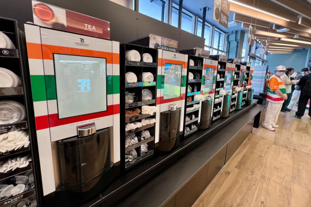首先是布局設(shè)計(jì)。為了避免人流交叉,“7-11咖啡”機(jī)設(shè)置在出入口附近,遠(yuǎn)離收銀臺(tái),優(yōu)化顧客動(dòng)線(xiàn)。其次,引入了點(diǎn)餐發(fā)券系統(tǒng)與數(shù)字顯示屏,顧客可通過(guò)觸控操作下單后再去購(gòu)物,最后在收銀臺(tái)統(tǒng)一領(lǐng)取現(xiàn)做商品。這種流程化的設(shè)計(jì)大幅提升了效率,也帶來(lái)近似快餐店的體驗(yàn)感。