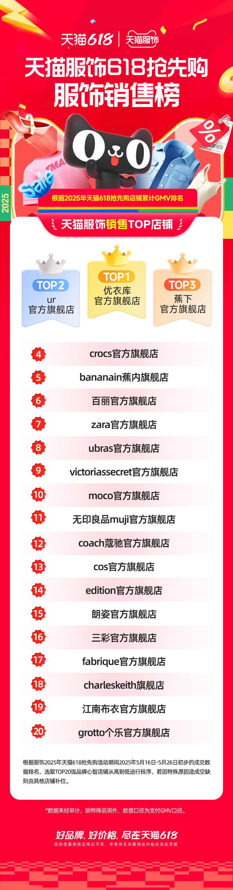 天貓服飾618搶先購爆品王商家榜顯示,優(yōu)衣庫、蕉下、crocs拿下前三。細(xì)分類目中,ubras、bolon暴龍、coach蔻馳等品牌,也憑借多款超級(jí)爆品拿下各類目第一。