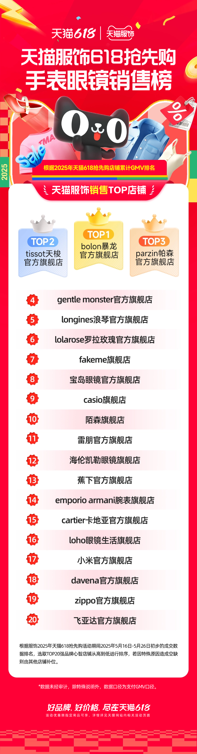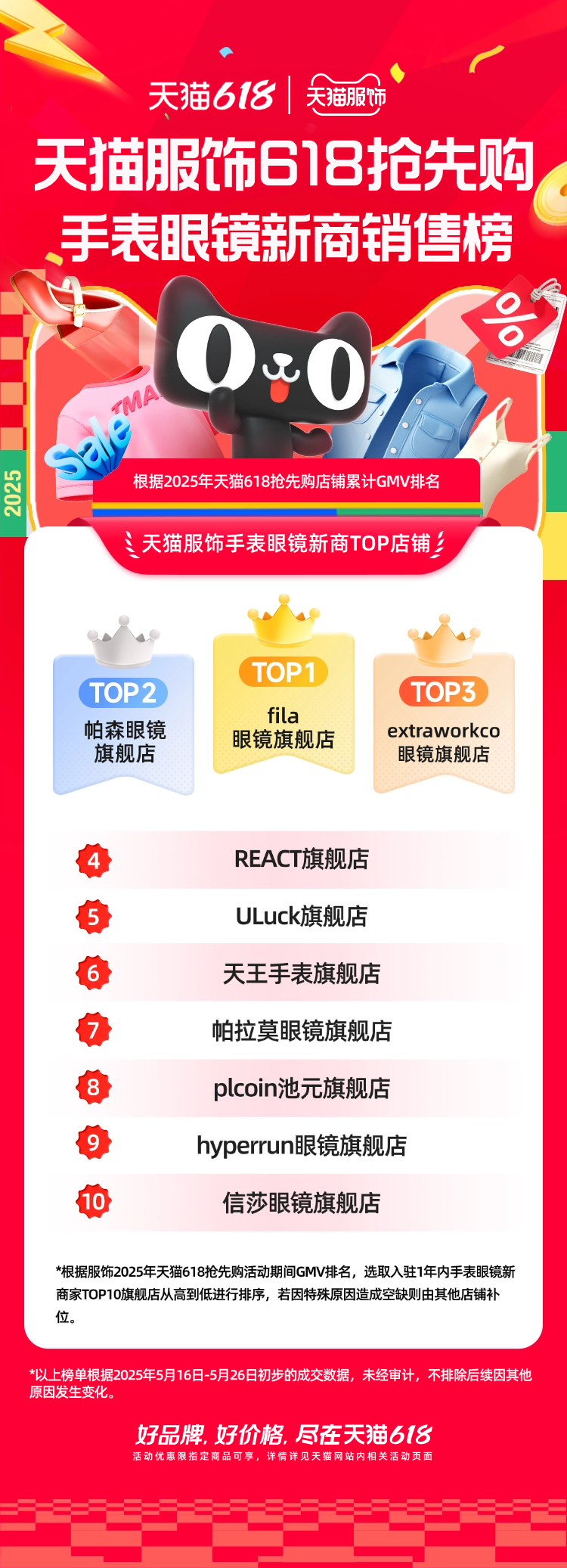 在男女鞋、手表眼鏡、箱包服配等其他細(xì)分類目,也涌現(xiàn)出了WeFlower、fila眼鏡、Dickies服飾配件等新商拿下類目TOP1。