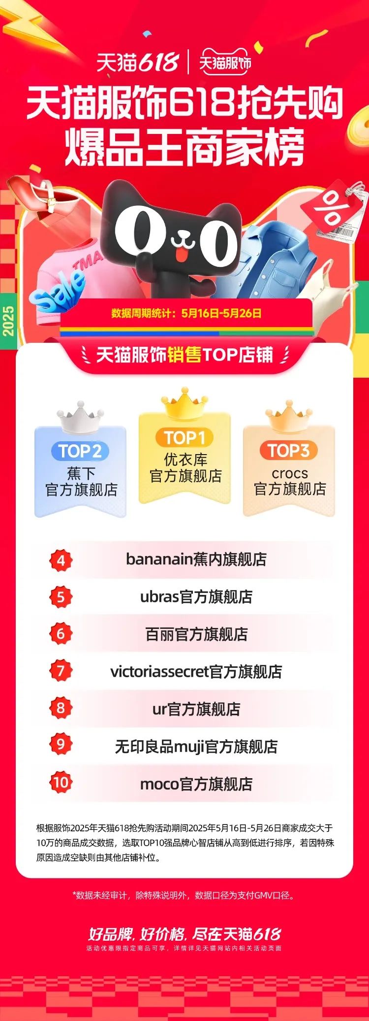 5月16日至5月26日,優(yōu)衣庫、UR、蕉下等多個(gè)品牌成交破億,近345個(gè)品牌成交破千萬,近3090個(gè)品牌成交破百萬。此外,約有1088個(gè)品牌成交同比超過500%。