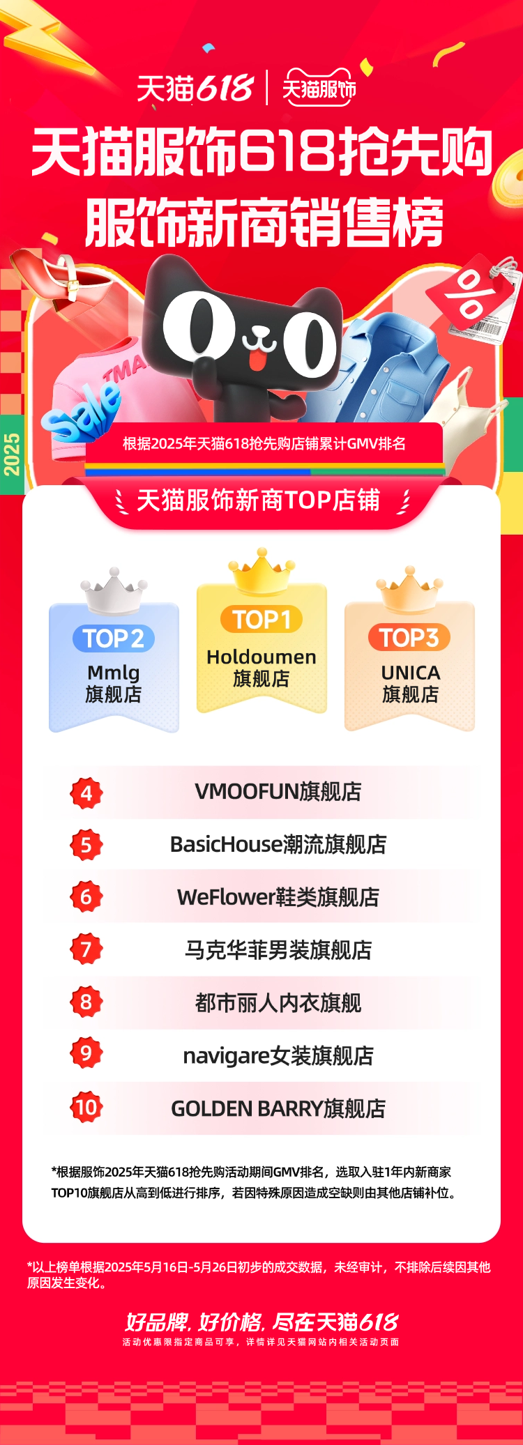 天貓618搶先購服飾新商銷售榜顯示,Holdoumen、Mmlg、UNICA登上TOP3。其中,Holdoumen過去30天銷量超70萬件,Mmlg近半年吸引20萬88VIP用戶下單,而他們?nèi)腭v天貓還不到一年時(shí)間。