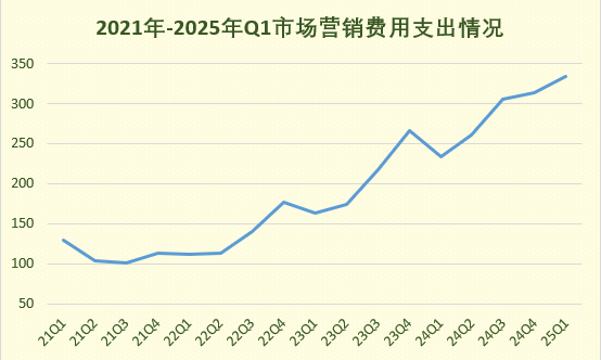從“銷售和市場費(fèi)用”一欄來看,2025年Q1,該項(xiàng)支出費(fèi)用為334.03億元,較去年同期的234.11億元,同比上漲了43%。盡管近幾年該費(fèi)用持續(xù)增加,但高于前年傳統(tǒng)電商節(jié)雙11所在的Q4季度,還是極為罕見。