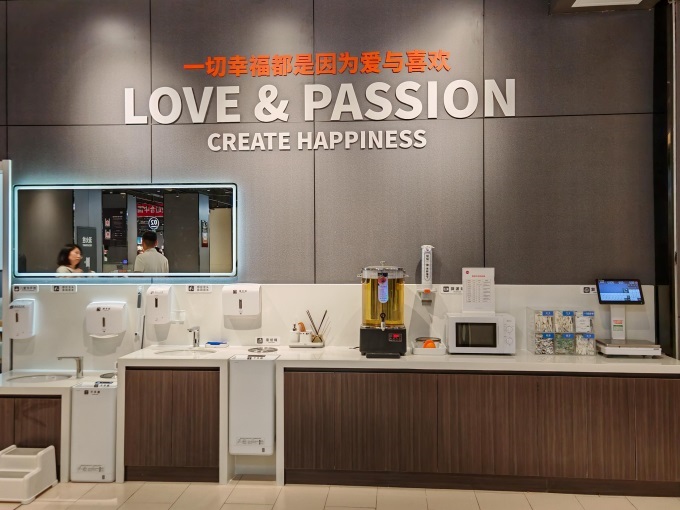門店打破傳統(tǒng)商超布局,中島貨架高度從2.4米下降至1.6米,營造通透視覺長廊,同時拓寬主通道,取消強(qiáng)制動線,讓購物更自由、更舒適。便民服務(wù)區(qū)免費(fèi)供應(yīng)四季茶飲,特設(shè)洗手臺、直飲水、1小時免費(fèi)使用的充電寶、寵物寄存處、血壓儀等,身高測量儀、視力表則成為親子互動打卡點(diǎn)。