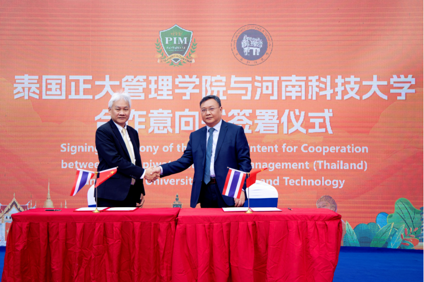 △泰國(guó)正大管理學(xué)院學(xué)術(shù)與研究發(fā)展事務(wù)副校長(zhǎng)宋洛,與河南科技大學(xué)副校長(zhǎng)穆云超簽署戰(zhàn)略合作意向書
