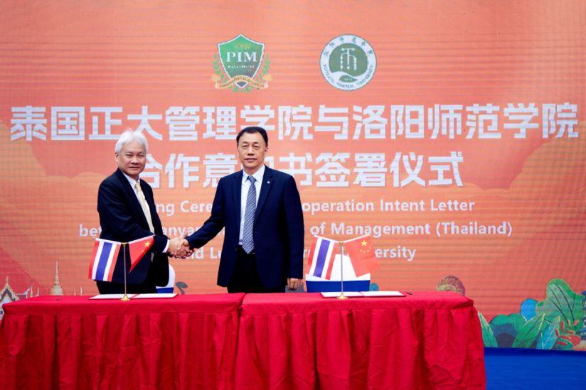 △泰國(guó)正大管理學(xué)院學(xué)術(shù)與研究發(fā)展事務(wù)副校長(zhǎng)宋洛,與洛陽(yáng)師范學(xué)院國(guó)際合作交流處處長(zhǎng)曲宏濤簽署戰(zhàn)略合作意向書