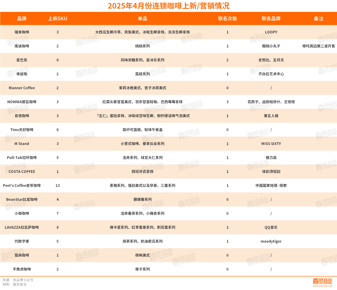 頭部品牌開始收縮SKU,聚焦聯(lián)名深度。瑞幸咖啡上新次數(shù)銳減,僅上新3款產(chǎn)品;庫(kù)迪咖啡上新數(shù)量由8款縮減至2款,更注重IP延續(xù)性,3月聯(lián)名哪吒與蠟筆小新,4月則繼續(xù)推哪吒周邊,并與櫻桃小丸子聯(lián)名;星巴克上新穩(wěn)定,與五月天的聯(lián)名引起較大反響,覆蓋年輕群體與情懷用戶。