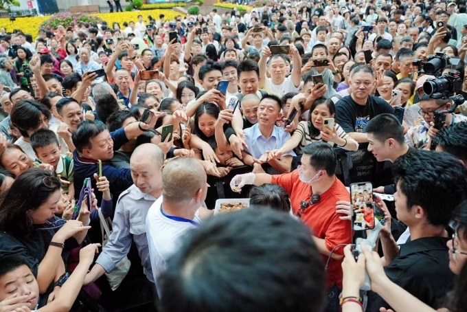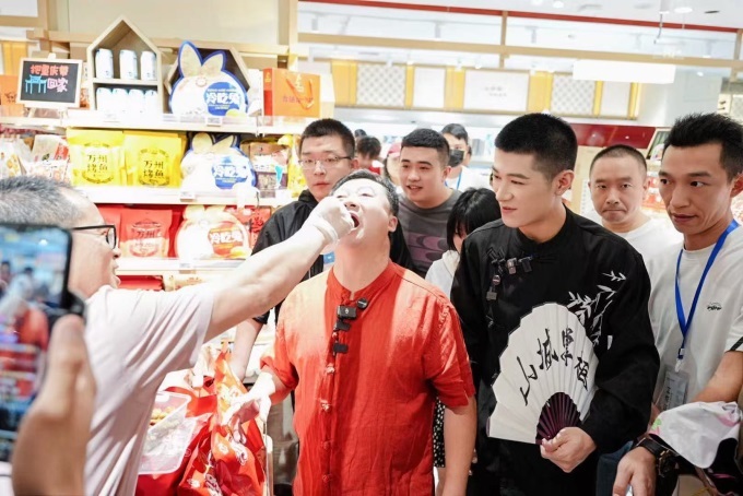 “山城掌柜”市集更致力于非遺的活態(tài)傳承與消費轉(zhuǎn)化,端午節(jié)期間,輪番上演合川桃片盲切、巫溪老鷹茶制作等非遺技藝動態(tài)展演。6月1日特別邀請火爆全網(wǎng)的榮昌“鹵鵝哥”作為“重百首席非遺文化推薦官”,重磅推出“鹵鵝全城免費投喂”活動,借勢非遺網(wǎng)紅流量強勢反哺非遺文化傳播,實現(xiàn)破圈效應(yīng)。