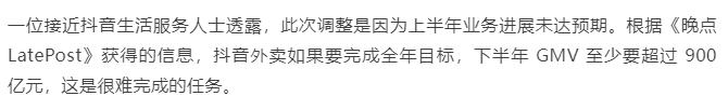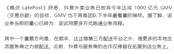 日單量成績很拉胯,全年目標(biāo)自然很難完成。彼時的6月份,據(jù)晚點介紹,抖音外賣業(yè)務(wù)已放棄達成1000 億元的年 GMV(交易總額)目標(biāo),并放棄將GMV視作最重要的指標(biāo),而是將重心轉(zhuǎn)向?qū)I(yè)務(wù)流程的多元化探索。
