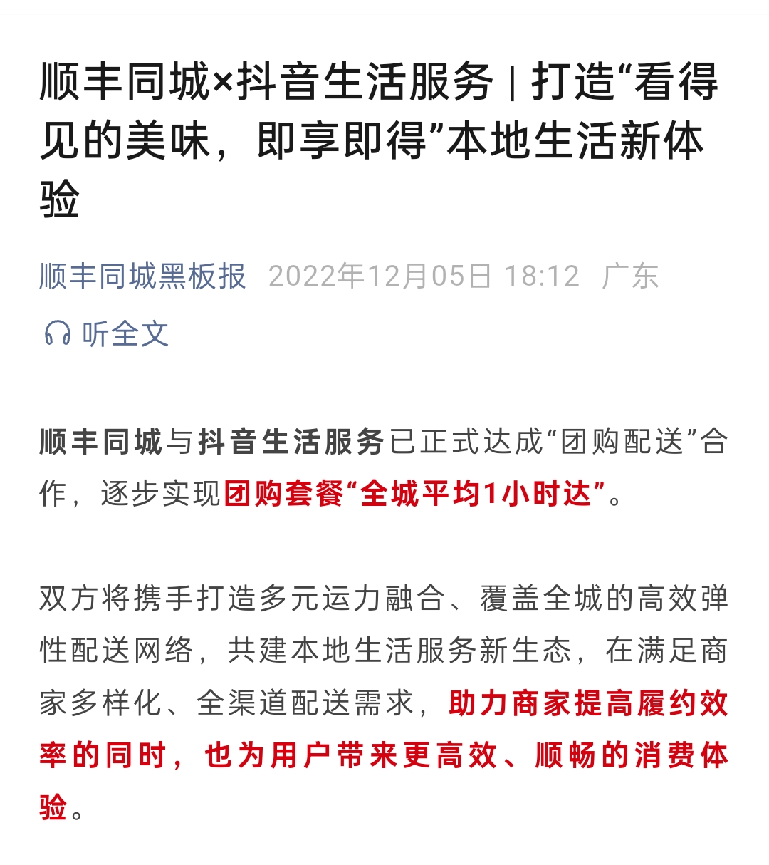 同一時間,順豐同城也發(fā)布了雙方合作的消息。公告中顯示,順豐同城與抖音生活服務(wù)已正式達成“團購配送”合作,逐步實現(xiàn)團購套餐“全城平均1小時達”。