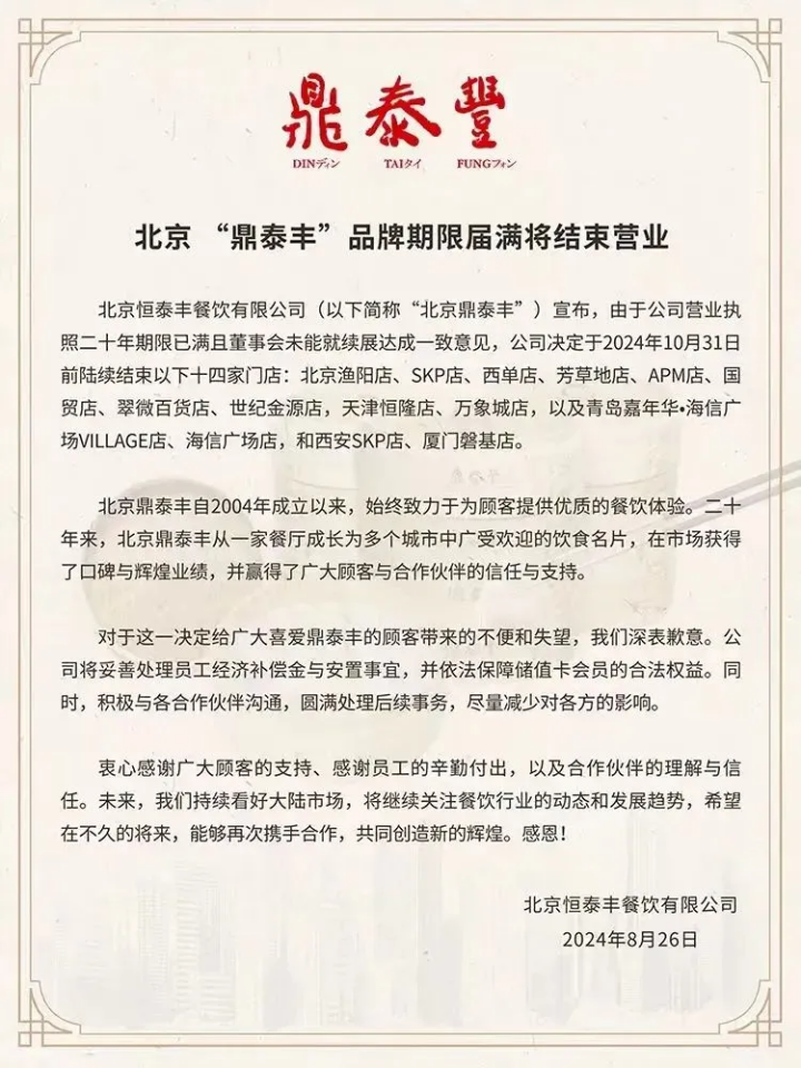 時間拉回2024年,鼎泰豐在大陸閉店更為頻繁。8月26日,北京恒泰豐餐飲有限公司通過“鼎泰豐DTF”微信公號宣布,因公司二十年營業(yè)執(zhí)照期限屆滿且董事會未就續(xù)展達成一致,決定于10月31日前關(guān)閉北京漁陽店、SKP店、西單店、芳草地店、APM店、國貿(mào)店、翠微百貨店、世紀金源店,天津恒隆店、萬象城店,青島嘉年華·海信廣場VILLAGE店、海信廣場店,西安SKP店、廈門磐基店,共14家門店。